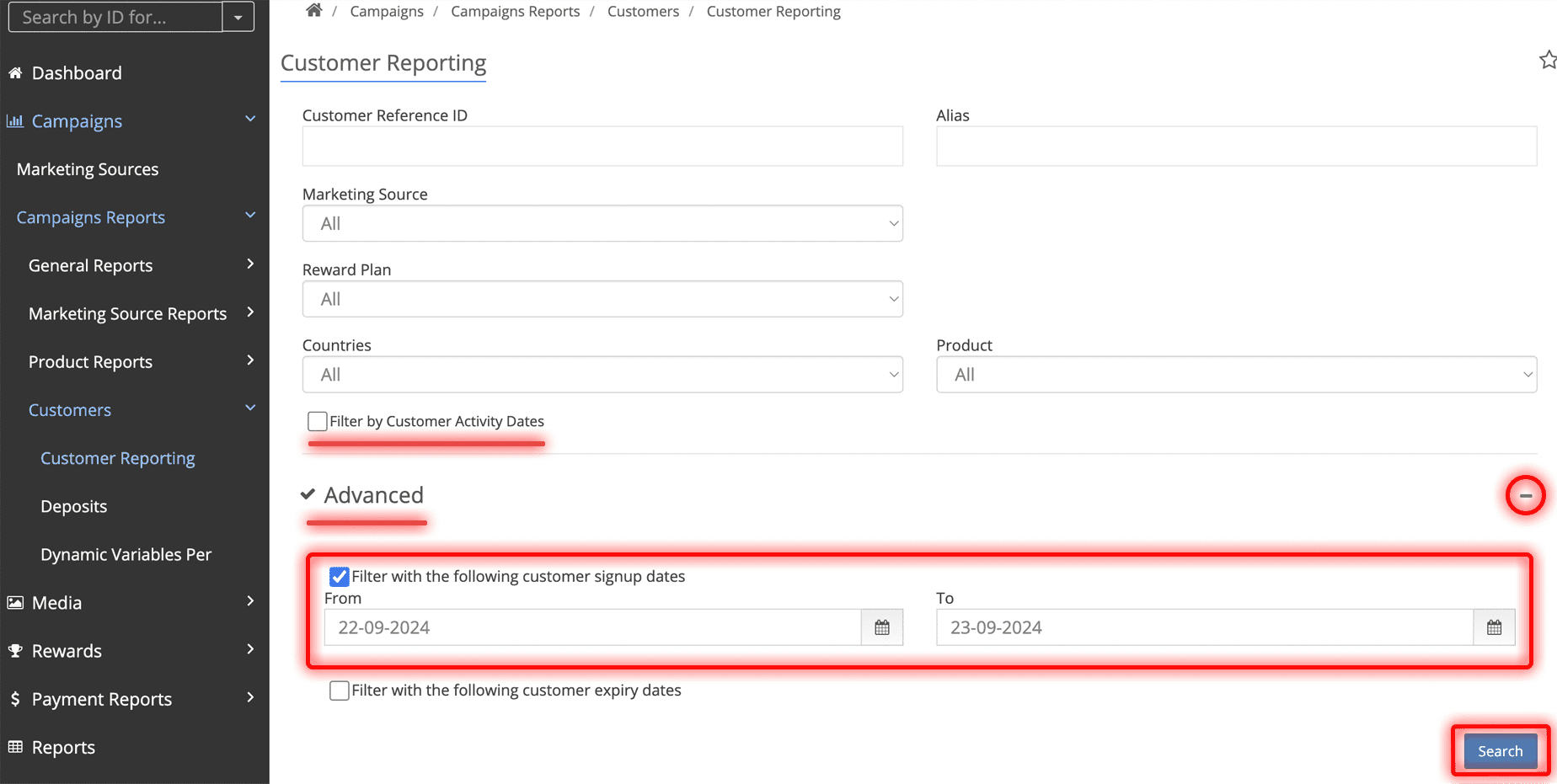 Asegúrese de que la opción «Filtrar con las siguientes fechas de registro de clientes» esté